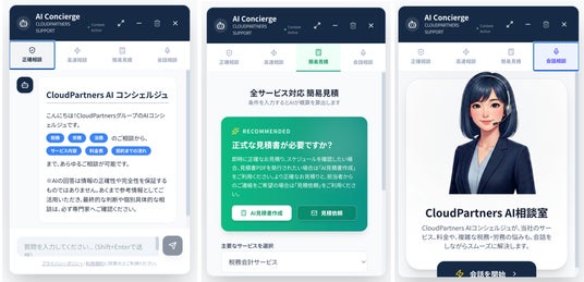 当社の料金やサービスについて24時間即座に回答するだけでなく、会計・税務・労務に関する複雑な質問に対しても、専門家が監修したAIが丁寧かつわかりやすく解説します。さらに、即時に簡易見積の作成依頼や、テキストだけでなくリアルタイムに会話をしながらの高度な相談も可能としています。