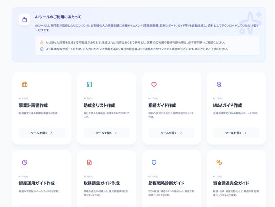 会社や事業者の現在の状況をAIが分析し、最適な「資金調達ガイド」や「バックオフィスDX化ガイド」を自動生成して提供します。