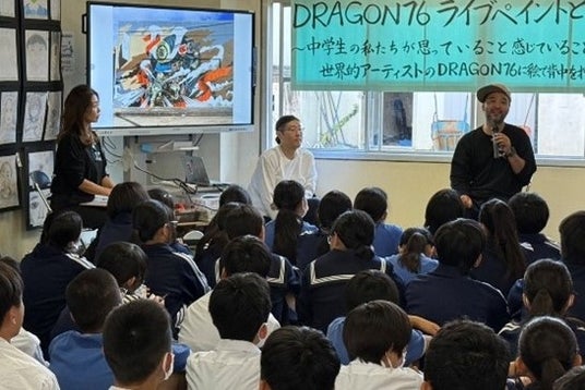 ism緑が丘のアートプロジェクト・アンバサダーを務めるDRAGON76氏は、10月上旬には、近隣のみどりが丘小学校、新木戸小学校、高津中学校を訪問し、同氏による活動説明を含めたトークとライブペインティングを実施。延べ約1,400名の児童・生徒を前に、「絵を描くことは自由。自分の手で世界をつくることができる」と語りかけ、完成までのダイナミックな制作過程で子どもたちを魅了しました。