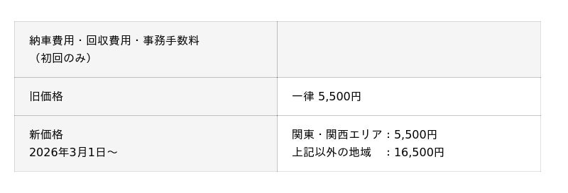 また、これまで納車費用・回収費用・事務手数料(初回のみ)は一律5,500円としておりましたが、