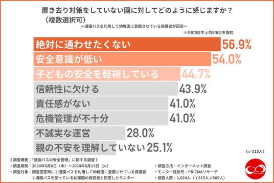 「置き去り対策をしていない園に対してどのように感じますか?(複数選択可)」と質問したところ、『絶対に通わせたくない(56.9%)』と回答した方が最も多く、次いで『安全意識が低い(54.0%)』『子どもの安全を軽視している(44.7%)』となりました。