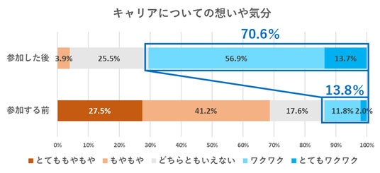 参加する前と参加した後の「キャリアについての想いや気分」についてを、段階評価で尋ねました。回答結果を比較してみると、多くの参加者の意識が、ワークショップに参加したことによって「もやもや」から「ワクワク」へとシフト。ワクワク派は13.8%から70.6%へと大きく増加しています。