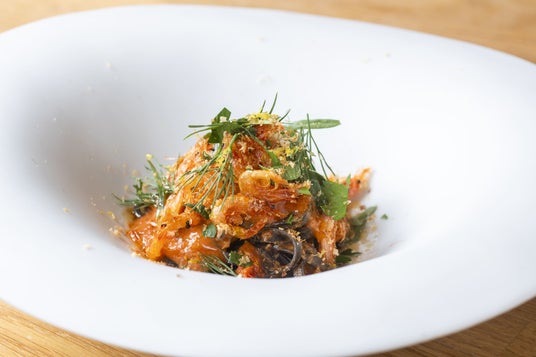 イカ墨を練り込んだリングイネに駿河湾特産の生桜えびの旨味を活かしたビスクソースをあわせています。ランチやディナーのコースで楽しめます。※コースでの提供