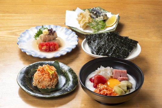 牧之原市特産の自然薯に桜えびとマグロ、静岡野菜をあわせ海苔も添えて「五色沼」と名づけています。折戸なすは焼きびたし、桜えびは卯の花和えで。料理長こだわりの特別メニューを楽しめます。※特別メニューの提供は17:00~