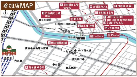 ◆参加店舗(50音順):榮太樓總本鋪、DA GOTO、日本橋 神茂、日本橋 蛇の市本店、日本橋だし場 本店、日本橋だし場 はなれ、日本橋 とよだ、日本橋 舟寿し、日本橋ゆかり、Peace、文明堂カフェ、平ちゃん、La Paix、 L’appetit、利久庵