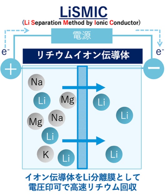 当社技術LiSMIC(Li Separation Method by Ionic Conductor)は(図1)、イオン伝導体というセラミックス製の板をリチウム分離膜とすることで、これまで困難であった有限であるリチウム資源の安定調達と循環(リサイクル)を市場に定着させます。