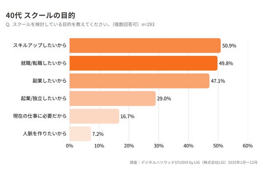 40代は「スキルアップ」が50.9%で1位に逆転。目的が拮抗する転換点