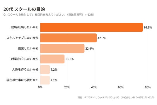 株式会社LIG(本社:東京都台東区、代表取締役:大山智弘)が運営するWebクリエイタースクール「デジタルハリウッドSTUDIO by LIG」(以下、デジLIG)は、スクールの説明会に参加した2,489名を対象に、スクール検討時の学習目的に関する調査を実施しました。