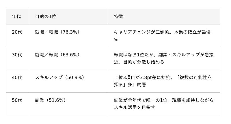 - 40代は「スキルアップ」(50.9%)が1位に逆転。上位3項目が拮抗し、複数の可能性を視野に入れた「多目的型」が主流