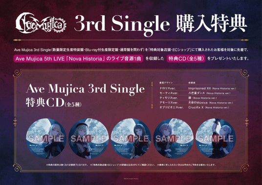 Ave Mujica 3rd Single「‘S/’ The Way / Sophie」(数量限定生産特装盤・Blu-ray付生産限定盤・通常盤を問わず)を「特典対象店舗・ECショップ」にて購入されたお客様を対象に先着で、「特典CD」1枚(全5種)をプレゼントいたします。