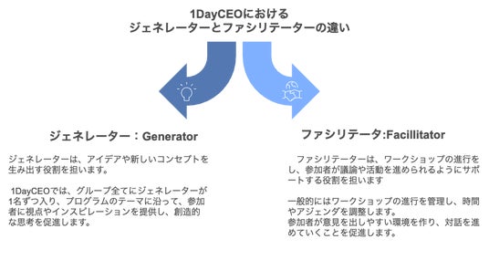 ※ジェネレーターとは以下の概念です。1DayCEOでは、全体のファシリテーター以外に全てのグループにジェネレータが参加し以下のような役割を担います。