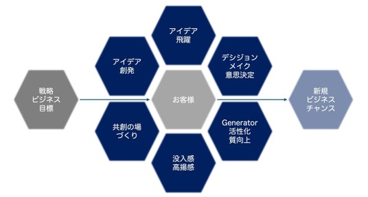 このような7つの課題に対し開発した「1DayCEO」は、新規事業創出におけるアイデアの創出と飛躍から意思決定に至るまでのフレームワークと独自のデシジョンメイキング(意思決定)メソッドを活用し、さらには当社認定ジェネレーターの介入により質の高いアウトプットを引き出すプログラムです。
