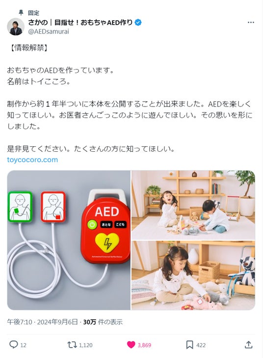 9/6(金) サイト公開から24時間で30万IMPに拡散。おもちゃAED『トイこころ』のホームページ公開。告知から約1年半を経て、製品完成!まもなく予約販売開始へ!