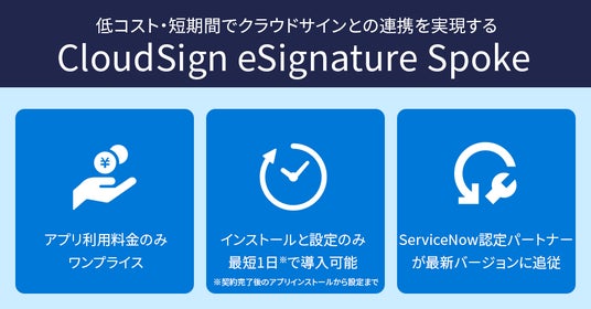 エクシオ・デジタルソリューションズ株式会社(本社:東京都港区、代表取締役社長:前田幸一)は、弊社開発によるServiceNowストアアプリ第二弾として「CloudSign eSignature Spoke」をリリースいたしました。本アプリケーションは、電子契約の国内シェアNo.1※である「クラウドサイン」とServiceNowを迅速に連携し、追加開発を必要とせず、低コスト・短期間で契約業務の自動化と業務負荷の大幅な軽減を実現します。