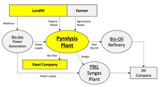 有機廃棄物の熱分解とは?有機廃棄物の熱分解(Pyrolysis)は、酸素を使わずに高温で有機物(生ごみなど)を分解し、バイオ炭、バイオオイル、シンガスなどを生成する技術です。このプロセスは、廃棄物の削減とともに、持続可能なエネルギー資源の生産にも貢献します。本プロジェクトでは、埋立地の有機廃棄物を活用し、年間6万トンの廃棄物から約2万トンのバイオ燃料を生産します。この技術はCO2排出量の削減に寄与し、バイオ燃料は高品質な石炭代替品として供給される予定です。