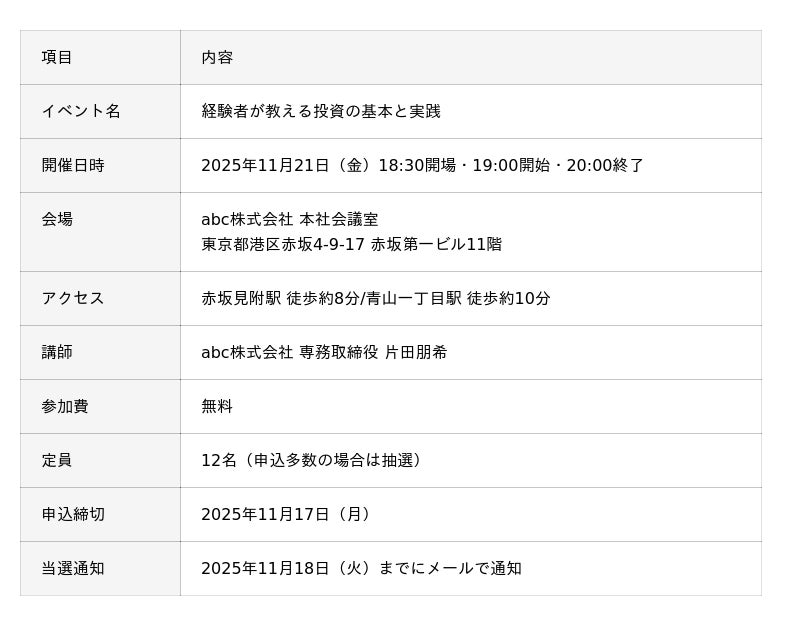 abc株式会社(本社:東京都港区、代表取締役:松田 元、以下「当社」)は、2025年11月21日(金)19:00より本社会議室にて、投資初心者から経験者まで幅広い層を対象とした無料投資セミナーを開催いたします。