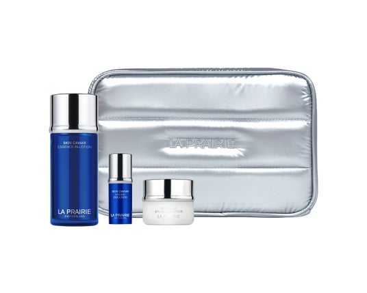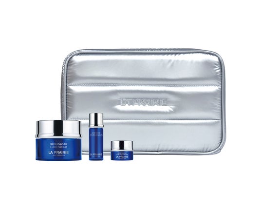 新サイズ「SC ラックス クリーム N」に、スキンキャビアコレクションの化粧液・目もと用クリームをセット。オリジナルポーチ付きの特別キット。