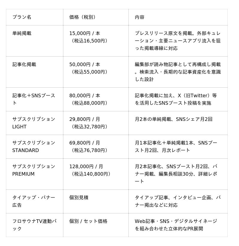 フロサウナPRは、スポット掲載・記事化だけでなく、サブスクリプション型の継続発信支援、タイアップ企画、バナー広告、さらに「フロサウナTV」との連動など、Webとリアルを横断したPR設計も強化してまいります。