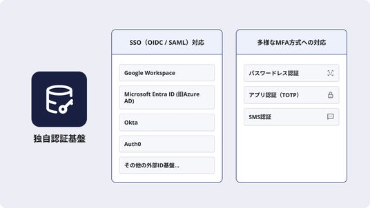 従来のSaaS型認証に依存しない構成により、OIDC / SAMLによるSSO統合、認証アプリ(TOTP)を用いた多要素認証(MFA)、重要操作時のステップアップ認証など、高度なセキュリティ要件に対応。認証データの保存リージョン制御や社内ID基盤との統合にも柔軟に対応可能となり、エンタープライズ企業に求められるセキュリティ・コンプライアンス・拡張性を同時に実現します。