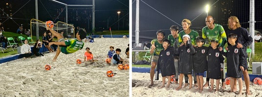日本サッカー協会の今井さんによるビーチサッカーコンテンツはとても大盛り上がり。サッカーゴルフやコーン当ては通常の芝生の上だと簡単でも、砂の深さが50cmもあるビーチサッカーコートだと急に難易度が上がります。参加者たちは砂のデコボコや沈む砂に苦戦しながら楽しんでポイントを競っていました。イベントの最後はエキシビションマッチとして北澤さん、茂怜羅選手、上里選手、大場選手、田中選手の5名によるドリームチームと各チームが対戦。日本代表経験選手たちの技術力に完敗し、各チームがなかなか点数が入れられない中、参加した小学生全員による連合チームが点数を入れると大歓声が上がっていました。