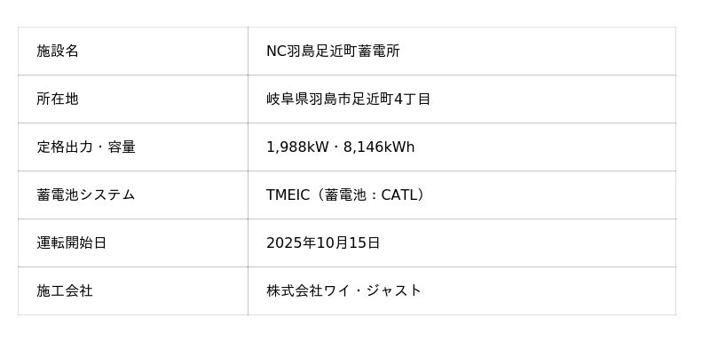 日本蓄電池株式会社(本社:東京都千代田区、代表取締役社長:漆原秀一)は、岐阜県羽島市足近町に建設した系統用蓄電施設「NC羽島足近町蓄電所」が、2025年10月15日に受電を開始したことをお知らせいたします。