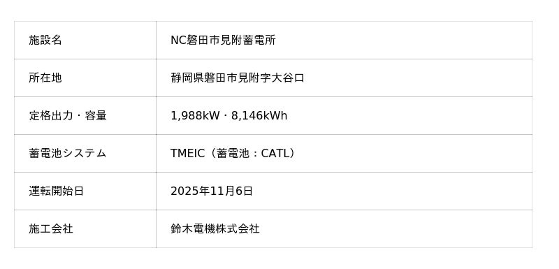 日本蓄電池株式会社(本社:東京都千代田区、代表取締役社長:漆原秀一)は、静岡県磐田市見附字大谷口に建設した系統用蓄電施設「NC磐田市見附蓄電所」が、2025年11月6日に受電を開始したことをお知らせいたします。