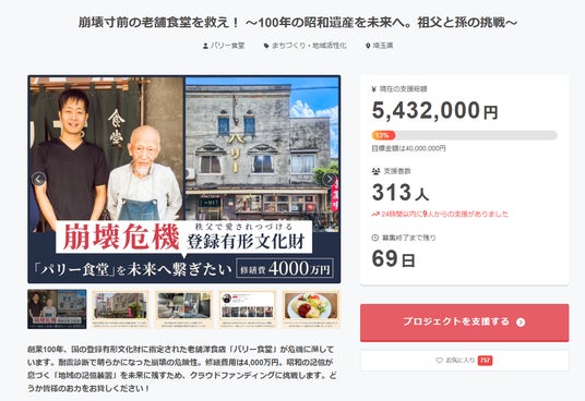 プロジェクト名:崩壊寸前の老舗食堂を救え! ~100年の昭和遺産を未来へ。祖父と孫の挑戦~