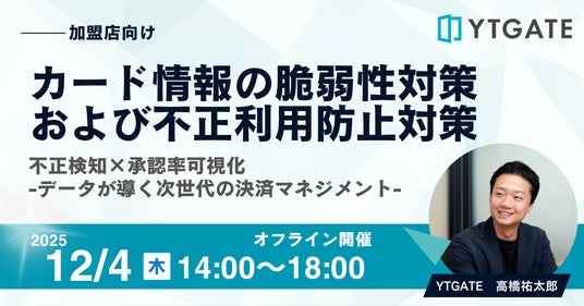 株式会社YTGATE(本社:東京都中央区、代表取締役:高橋祐太郎、以下「YTGATE」)は、2025年12月4日(木)、日本カード情報セキュリティ協議会(以下、「JCDSC」)が主催するセミナー『クラウドで実現:加盟店向けカード情報の脆弱性対策および不正利用防止対策』に、代表・高橋が登壇することをお知らせいたします。