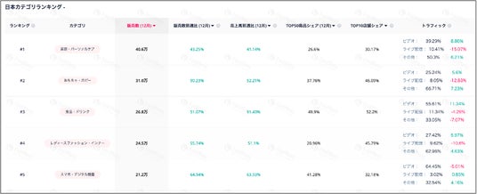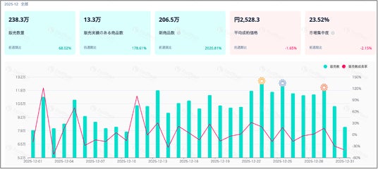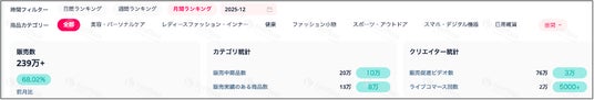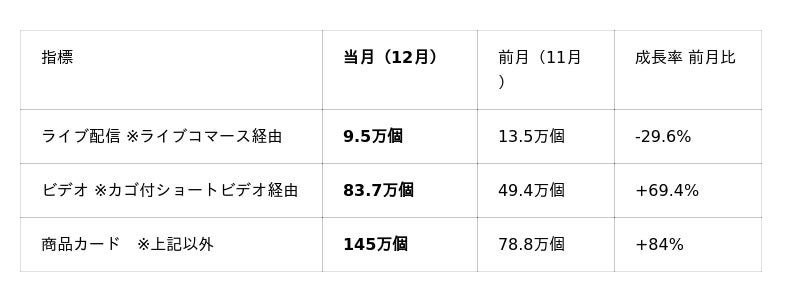 12月も11月に引き続き、前月比成長率が60%を超える高水準の成長を維持しています。その背景として、11月に続く新商品数の増加や、12月に実施されたプラットフォーム主導の年末向けセールなどの販売施策が成長を押し上げたことが挙げられます。加えて、12月は販売ショートビデオの投稿本数およびライブコマースの実施本数が前月比でいずれも100%以上増加しており、これらの施策が全体の販売量拡大に大きく寄与したと考えられます。