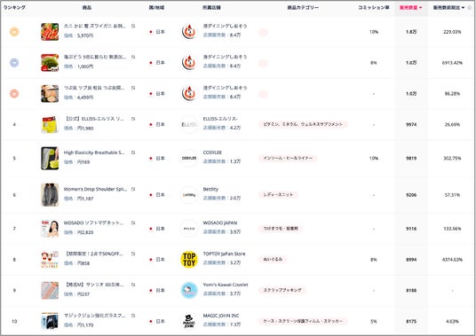 12月は、1位~3位を「港ダイニングしおそう」の商品(カニ、海ぶどう、つぶ貝などの海鮮食品)が占め、上位を独占する結果となりました。一方、10月・11月と2か月連続で1位を獲得していた**「ふわふわブランケット(店舗:Cashio)」はTOP10圏外となっています。また、10~11月にかけて急速に販売を伸ばした「お米(新米)」は16位に1商品がランクインしたものの、販売数量全体としては大きく減少**しています。4位には、前月より順位を上げた**「ビタミンCサプリ(店舗:ELLISS-エルリス-)」がランクインしました。5位には「インソールシューズ(店舗:COSYLEE)」が新規ランクインしており、単価200円前後の低価格インソールが12月に約1万個販売されています。さらに、8位・9位には12月のクリスマス需要を背景としたおもちゃ・TOY系商品**がランクインしており、季節要因の影響が色濃く表れています。
