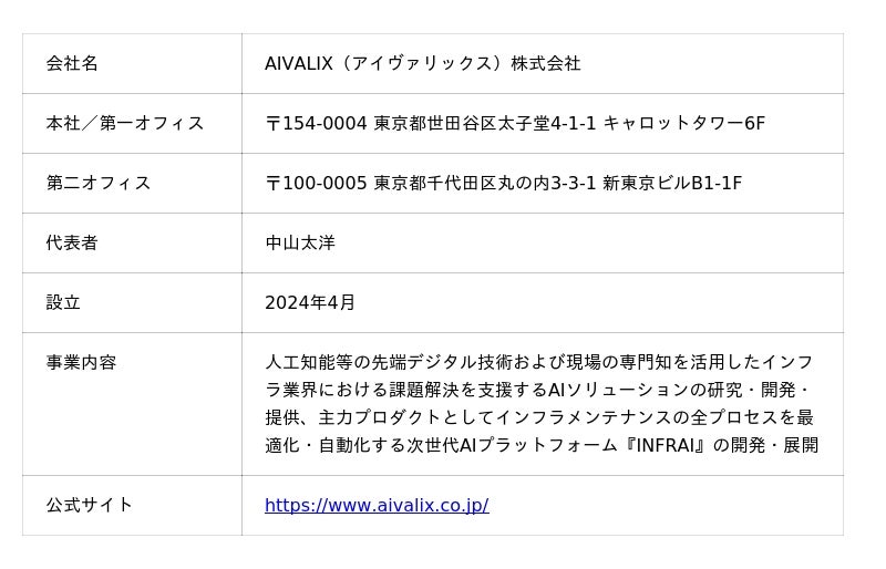 AIVALIX株式会社(本社:東京都世田谷区、代表取締役社長:中山太洋、以下「AIVALIX」)は、長野県小諸市において水道事業の包括委託を担う株式会社水みらい小諸(本社:長野県小諸市、代表取締役社長:東郷友裕、以下「水みらい小諸」)と連携し、AIVALIXが開発するインフラAI基盤モデル「INFRAI(インフライ)」を活用した実証実験を開始いたしました。