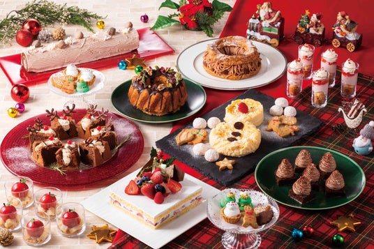 クリスマス定番ケーキ「ブッシュ・ド・ノエル」のほか、ドライフルーツとナッツの食感がたのしい「クグロフ」、豊かに栗が香る「パリブレストモンブラン」や「トナカイのカフェモカシフォンケーキ」など、クリスマスの雰囲気を盛り上げるスイーツが大集合。