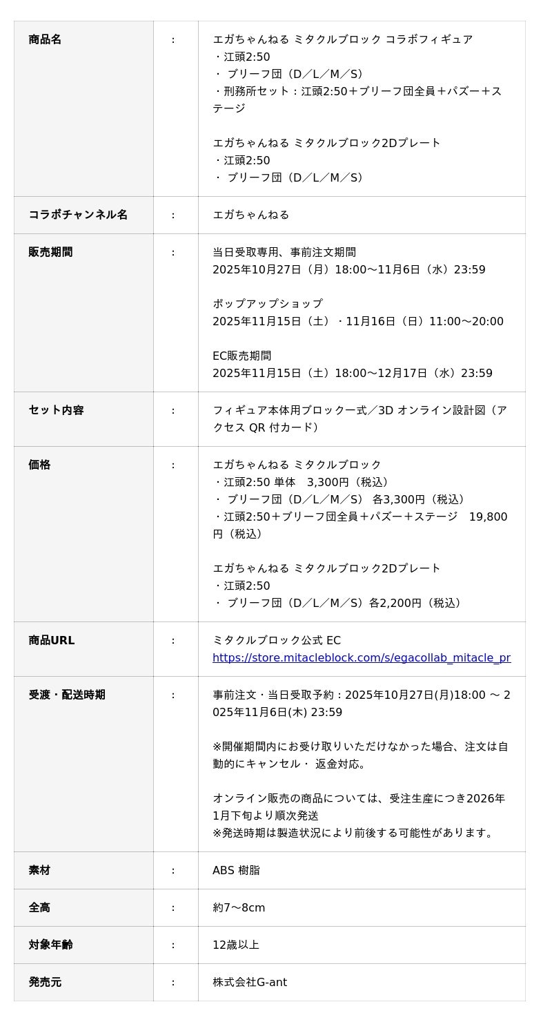 株式会社G‑ant(所在地:東京都中央区、代表取締役:平川彰悟)は、YouTubeのチャンネル登録者数492万人(2025年10月現在)を誇る人気YouTubeチャンネル『エガちゃんねる』の登場メンバーとその世界観を再現した組み立てブロックフィギュアシリーズ「エガちゃんねる ミタクルブロック コラボフィギュア」を、ミタクルブロック公式ECにて受付開始いたします。本コラボ商品は、11月15日(土)・16日(日)のポップアップショップにて先行販売を行い、11月15日(土)から12月17日(水)まで、ミタクルブロック公式ECでは受注生産にて販売を行います。