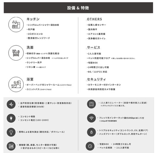 本物件では、次世代クリエイターの理想の住まいを目指した設備をご用意しております。全戸防音仕様としているため、時間を気にせず集中して音楽制作に励むことができます。また、欧米の機材などに対応する100V・200Vのコンセント電圧を配置した設備仕様のほか、フレッツ光インターネットを最大10Gbps※2まで利用可能です。