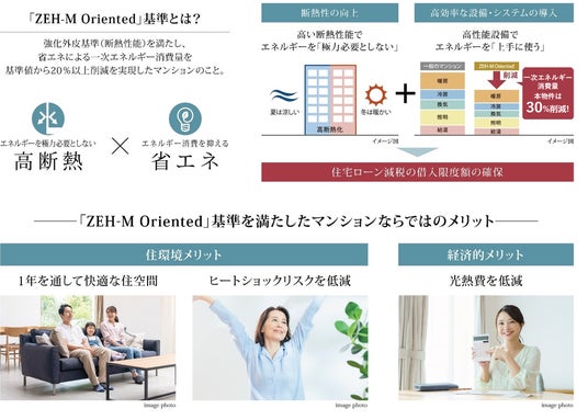 本物件は、強化外皮基準(断熱性能)を満たし、省エネによる一次エネルギー消費量を基準値から30%以上削減(本物件では31%削減)を実現したマンションとして、「ZEH-M Oriented」基準を満たします。また、建築物省エネ法に基づく建築物省エネルギー性能表示制度「BELS(ベルス)」による第三者認証では☆4※6、7を取得しています。