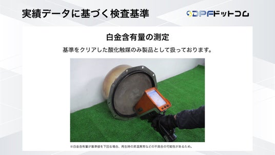 当社のリビルト品は、切断後および洗浄後の計2回にわたり、酸化触媒に含まれる「白金含有量」を厳密に測定しています。白金含有量が基準値を下回っていると、装着後に「再生時の昇温異常」などの深刻な不具合を引き起こす可能性があるためです。この厳格な自社基準をクリアした酸化触媒のみを製品として扱っており、これが高い信頼性の担保に繋がっています。
