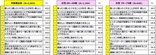 調査の結果、プログラム継続の目的は「歌ったり踊ったりすることが好き・楽しい」(69.2%)がトップで、音楽を通じた「気分転換・息抜き」(62.7%)や仲間との交流を求め、アクティブな生活を送るシニア像が浮かび上がりました。