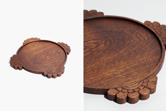 日本の仏教美術に見られる花模様を、丸盆に配しました。仏像では、インドの神々に