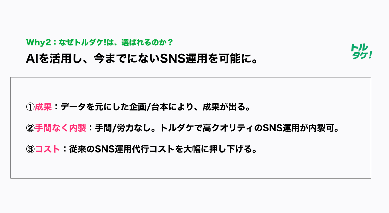 トルダケ!!は、“AIによる自動化”で成果&工数削減し、“内製化”によって固定費を抑える、次世代のSNS運用モデルを実現します。