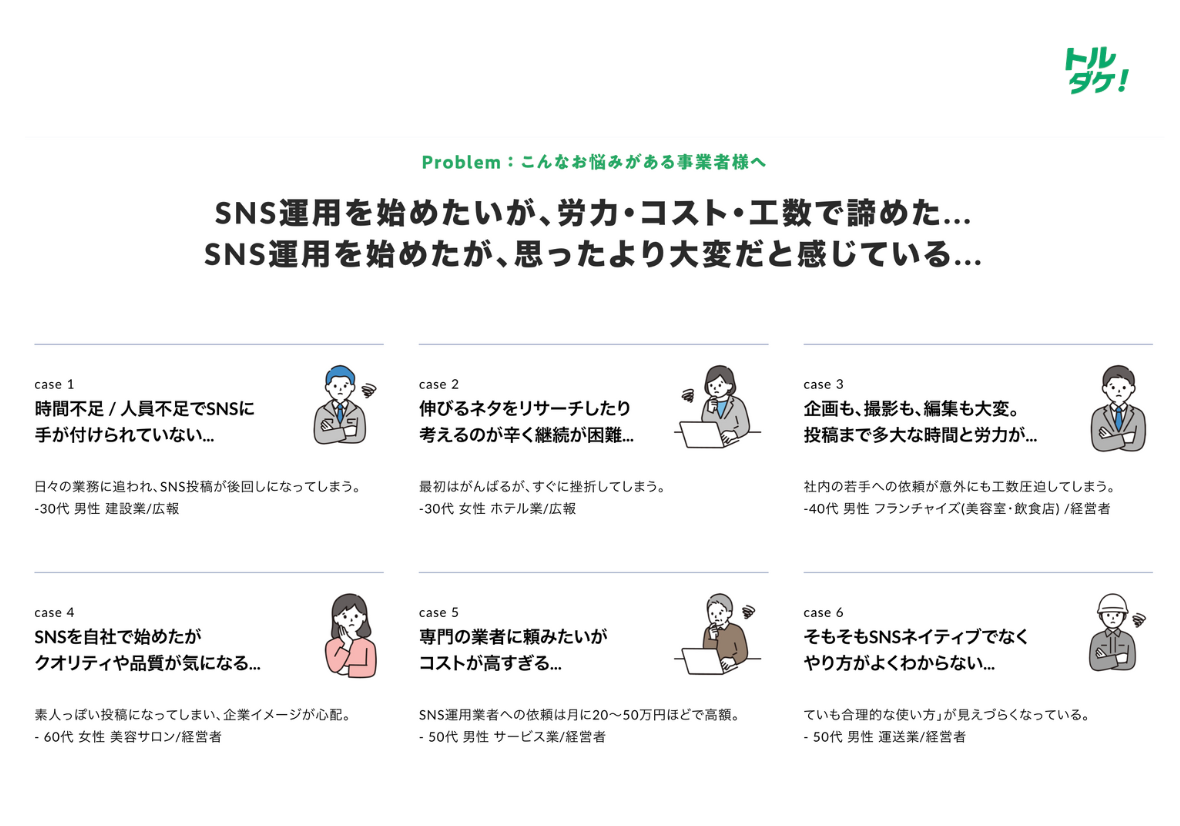 多くの企業がSNSの重要性を理解しながらも、「ネタが思いつかず継続が困難」「やりたいけど、時間や工数がかかる」「依頼したいがコストが高い」などといった課題に直面しています。
