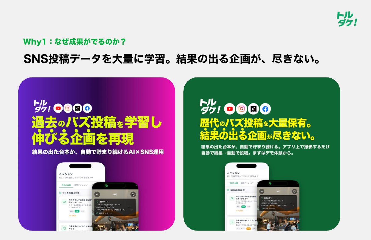 過去のバズ投稿を学習し成果の出るショート動画SNS運用を行える、「トルダケ!!」(https://torudake-snsmarketing.com)をプレリリースしました。