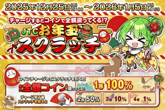 目玉企画となる「JTCお年玉スクラッチ」は、期間中にコインをチャージするだけで参加できるハズレなしの還元イベントです。