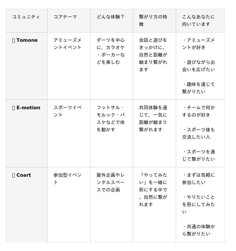 友達作りを目的にイベントへ参加したい20代・Z世代のあなたが、会話や関係性を自然に築けるよう、活動内容の種類を分けて設計しています。【Z世代向けの3コミュニティの違い(選び方の目安)】