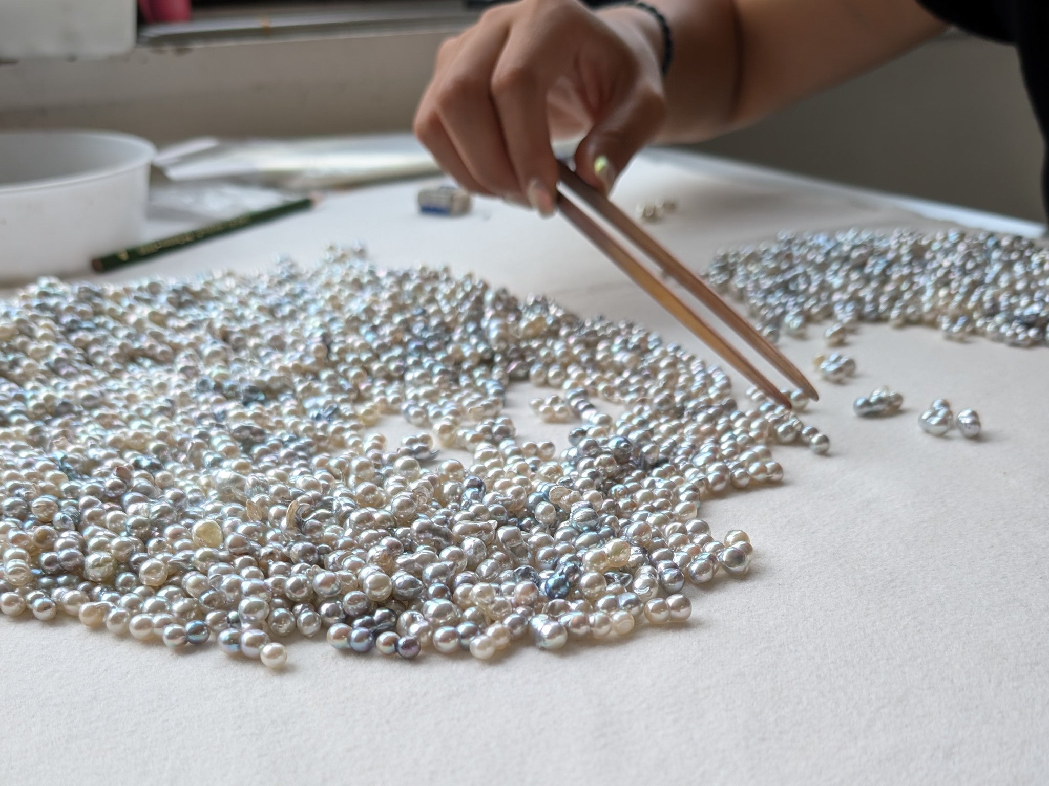 日本の真珠業界では古くから「美しい真珠=丸い・キズがない・強い光沢がある」とされ、厳しい品質基準が設けられてきました。その結果、「あこや真珠」のブランドとしての信頼性は確立された一方で、基準に満たない真珠──いわゆる“規格外”とされる真珠も多く存在します。形が不揃いなため製品化が難しく、市場では十分に評価されてきませんでした。