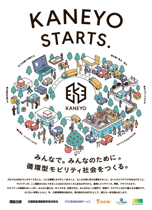 福島日産自動車株式会社(以下、「福島日産」)代表取締役社長の金子與志幸は、事業管理会社「日産商事株式会社」を2026年1月5日(月)付けで、社名を「株式会社KANEYO」に変更いたします。福島日産、日産部品福島販売株式会社、株式会社福島情報サービス、カーセブン郡山香久池店、株式会社ナプロアース、株式会社EV GARDENが「新生KANEYOグループ」として、だれでもお出かけしやすく、人にも環境にもやさしい、もしもの時に安心を提供し、まいにちにワクワクを生みだす循環型モビリティ社会の実現を目指し、スタートいたします。