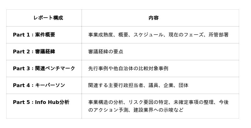 従来、新規案件情報はサウンディング調査が公表された段階で把握するのが一般的でしたが、この段階では既に多数の企業が動き出しています。Info Hubは議会の委員会レベルで議論されている情報 ― すなわち、サウンディング調査の前段階にある「兆候」― を体系的に収集・分析し、「公共事業 予兆・案件リスト」として提供します。さらに、関心のある案件については「公共事業 予兆・案件詳細レポート」をオーダーメイドで作成し、戦略的アクションを支援します。