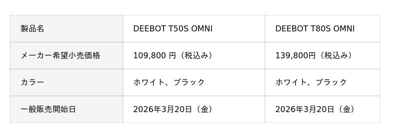 研究開発から製造、販売までを一貫して行い、家庭用ロボットをグローバルに展開する総合メーカー、エコバックスジャパン株式会社(本社:東京都千代田区、社長:梅田永智)は、2026年3月20日(金)から、公式オンラインストア限定、圧倒的な清掃力を誇るTシリーズの進化型モデル「DEEBOT T50S OMNI」と「DEEBOT T80S OMNI」を発売いたします。本製品は、フラッグシップ級の性能と価格のバランスを両立し、家具の下まで入り込む薄型設計や強力な吸引力、最新のAI技術により、これまでにないスマートな清掃体験を提供します。