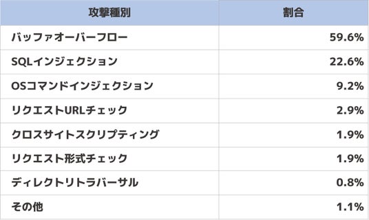 集計期間中に検出した攻撃を分類すると以下のようになります。5割を超える「バッファオーバーフロー」に次いで「SQLインジェクション」も多数検出し、この2つの検出で8割以上を占める結果になりました。なお、「バッファオーバーフロー」は、2024年第2四半期までは「その他」に分類していましたが、2024年第3四半期以降は多数検出しているため、個別の分類にして集計しております。