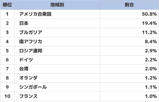 最後に接続元の分類です。集計期間中における地域別の検出数は以下の通りでした。アメリカ合衆国からの攻撃アクセスが5割を超え、続いて日本という結果に。前回の第3四半期と同様にアメリカ合衆国からの攻撃アクセスが半数以上を占める結果となりました。