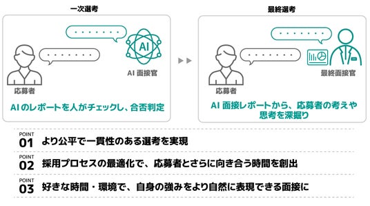また、 AI面接は、あくまで選考の質を高めるための補助材料と考えており、一次選考の合否については、AIの分析レポート結果を採用担当者が確認したうえで判断します。加えて、当社従業員とのコミュニケーション機会によって相互理解を深め、当社の風土を実感していただくことを重視しています。